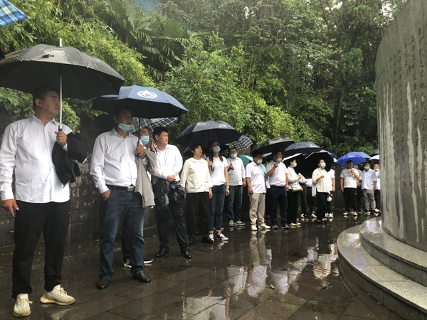 大家懷著崇敬的心情冒著小雨從山腳拾級而上,來到侵華日軍侵華日軍盱城大屠殺遇難同胞紀念碑前瞻仰,面對紀念碑集體默哀、深深鞠躬,以表達對遇難同胞們的沉痛哀思。
